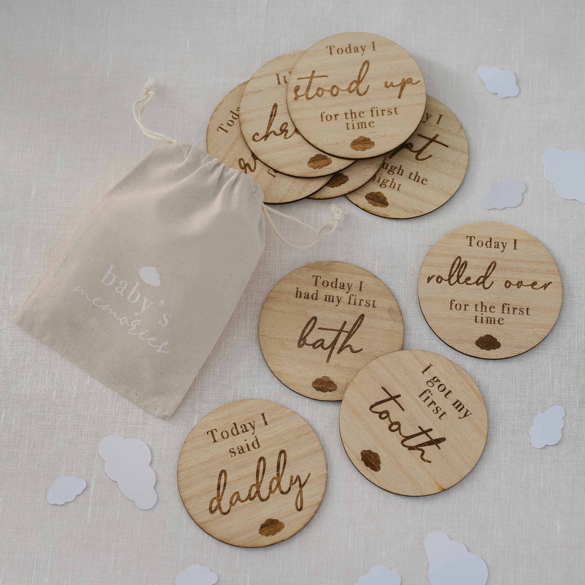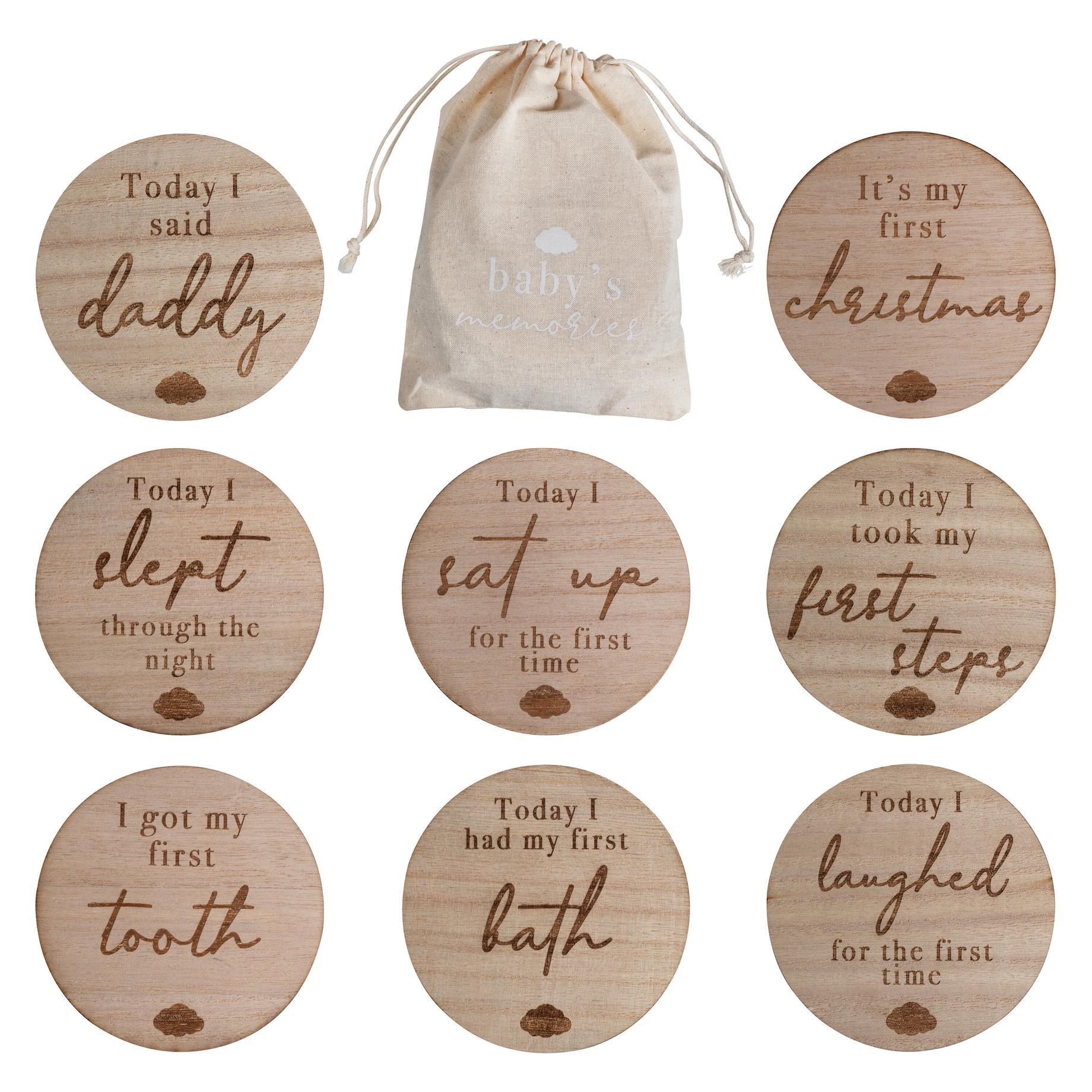 Mark your little one's milestones with our wooden milestone tokens. Capture a photo at every special stage to document and treasure your baby's growth. Each pack contains 8 x wooden double-sided baby milestone tokens each at 10cm high by 10cm wide with keepsake canvas bag.
